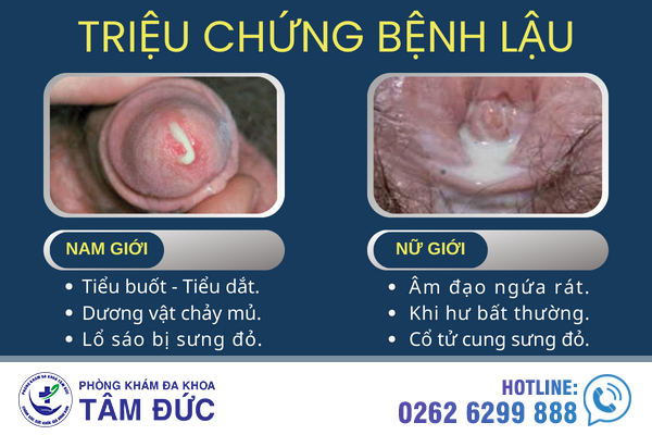 Ở nam thì sưng nề miệng sáo, tiểu đau như dao cứa, có giọt mủ chảy ra vào sáng sớm, sau tiểu. Còn nữ giới lậu thường phát hiện khi đã sang giai đoạn mãn tính, âm đạo, âm hộ, môi lớn, môi bé sưng đỏ, ra nhiều khí hư màu vàng, hôi hám.