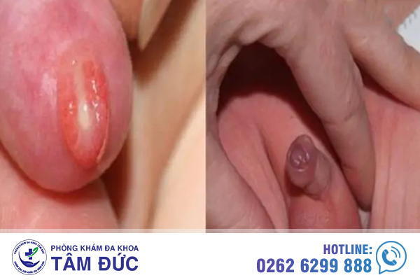 + Tuột bao quy đầu bị sưng phồng mọng nước.