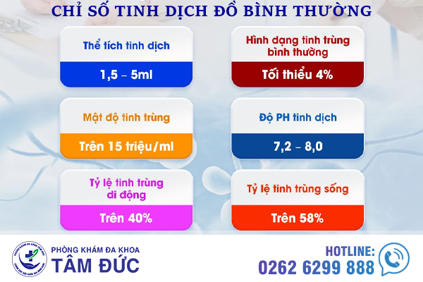 Khối lượng mỗi lần xuất tinh từ 1,5 – 5ml; Mật độ tinh trùng trung bình là trên 15 triệu/ml; Độ di động >40% trong đó di động nhanh >25%. Hình thái bình thường >50%. Không có hồng cầu, có dưới 1 triệu bạch cầu trong 1ml tinh dịch.